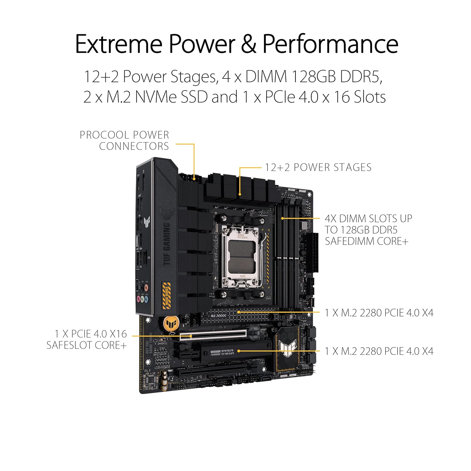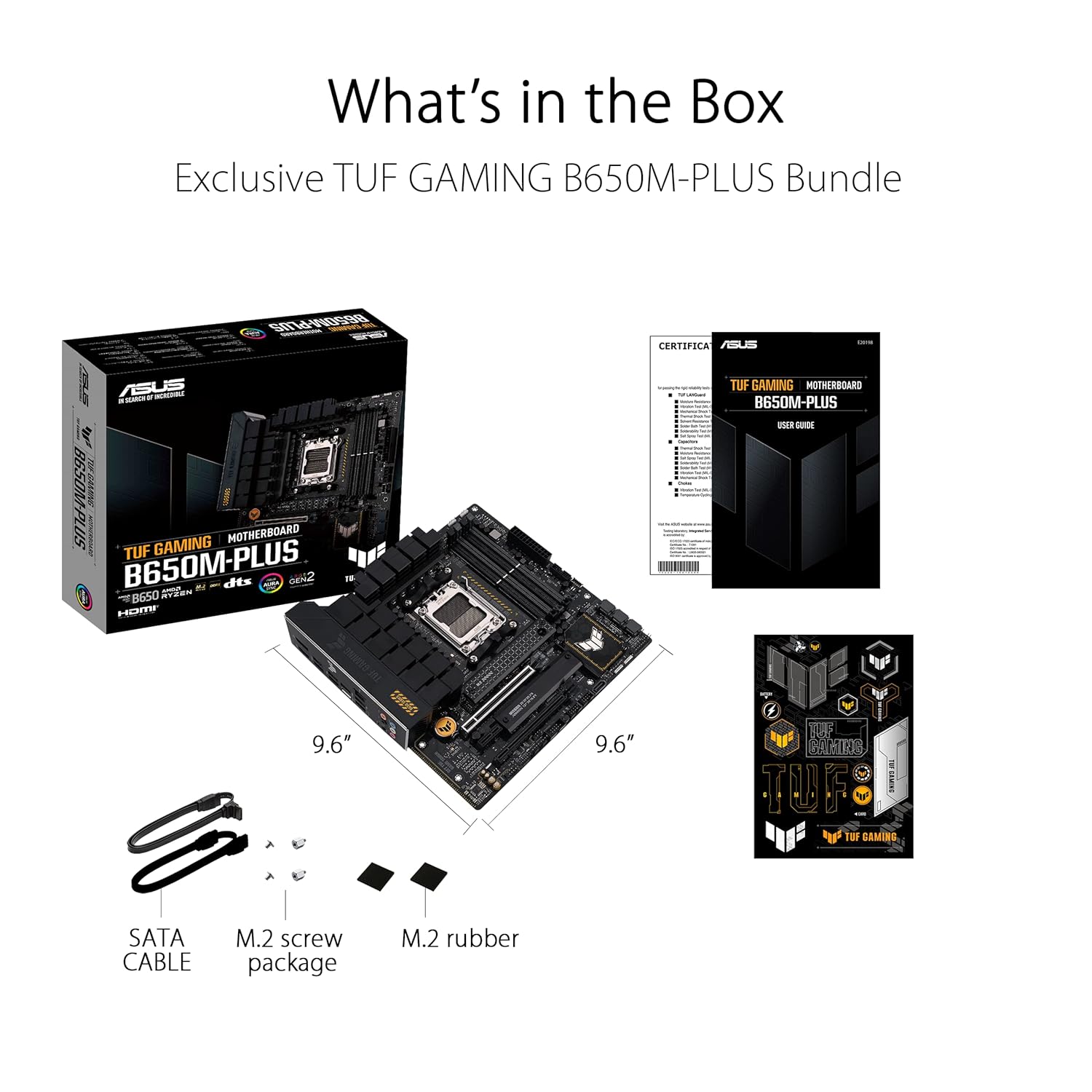 ASUS TUF GAMING B650M-PLUS takes all the essential elements of the latest AMD Ryzen 7000-series processors & combines them with game-ready features and proven durability. Engineered with military-grade components, an upgraded power solution & a comprehensive cooling system, this motherboard goes beyond expectations with rock-solid & stable performance for gaming. TUF GAMING motherboards also undergo rigorous endurance testing to ensure that they can handle conditions where others may fail.