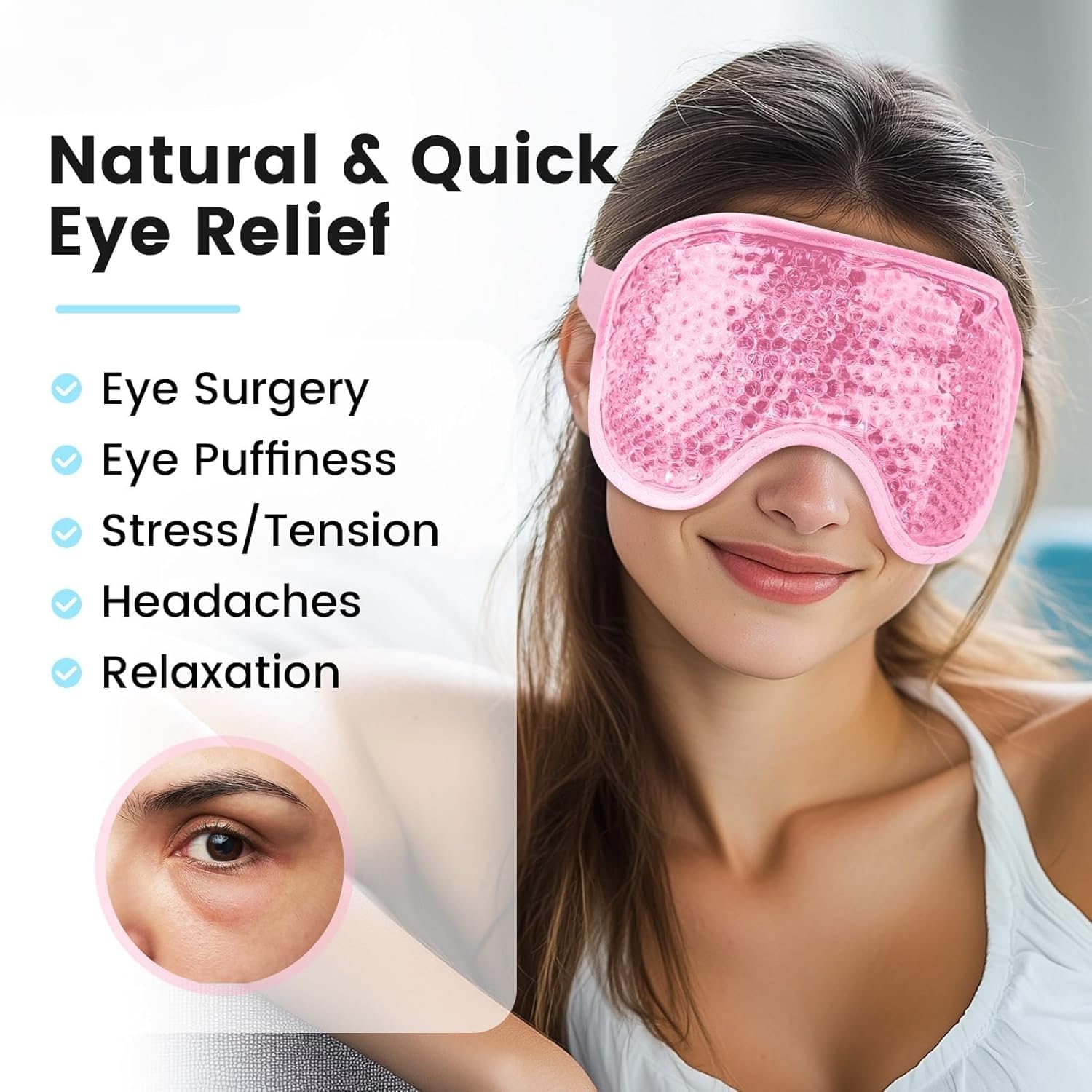 RELIEVE DISCOMFORT: The gel bead eye mask is a quick and easy way to relieve your eye discomfort. Freezing the cooling gel eye mask and put it on your eyes to reduce puffiness from a night of poor sleep or a late night, or to relieve tired eyes that have been staring at a computer all-day