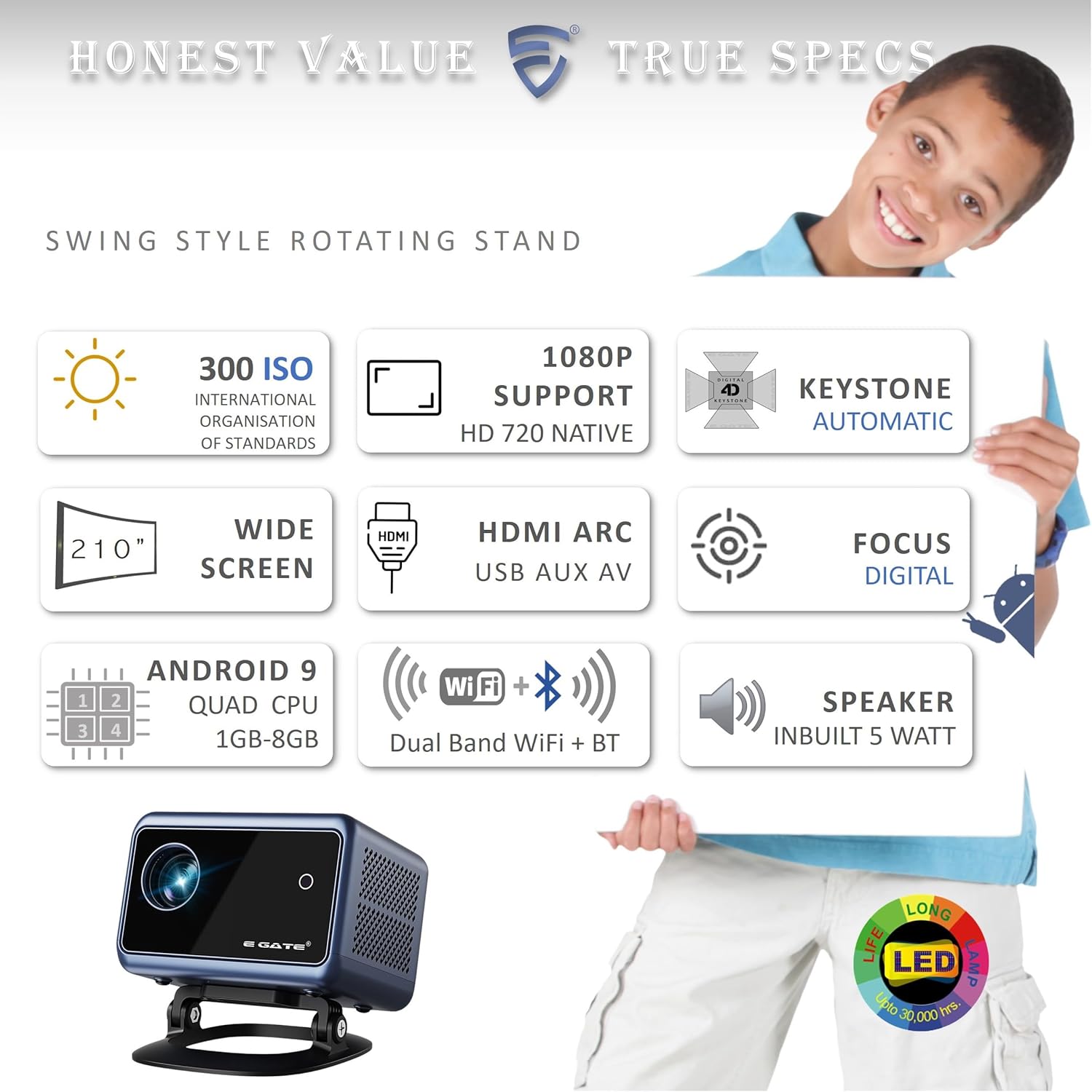 【Special Feature】 : Free Swing Style Stand for convinient projection angle – No need to Ceiling Mount | Automatic Keystone & Digital Focus | Quad Core CPU – MALI GPU | 1GB RAM + 8 GB ROM | Preloaded NETFLIX and other OTT | Android 9.0 | Dual Band Wifi | HD 720p Native