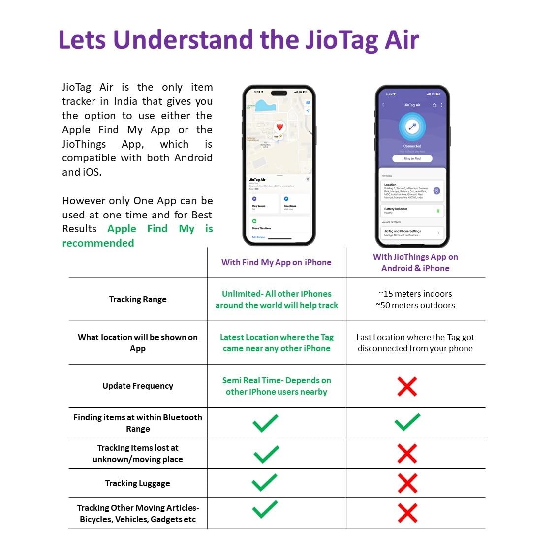 For JioThings Users on Android and iOS, range is upto 15 meters indoors (Bluetooth range). For best results use on Apple Find My App only.