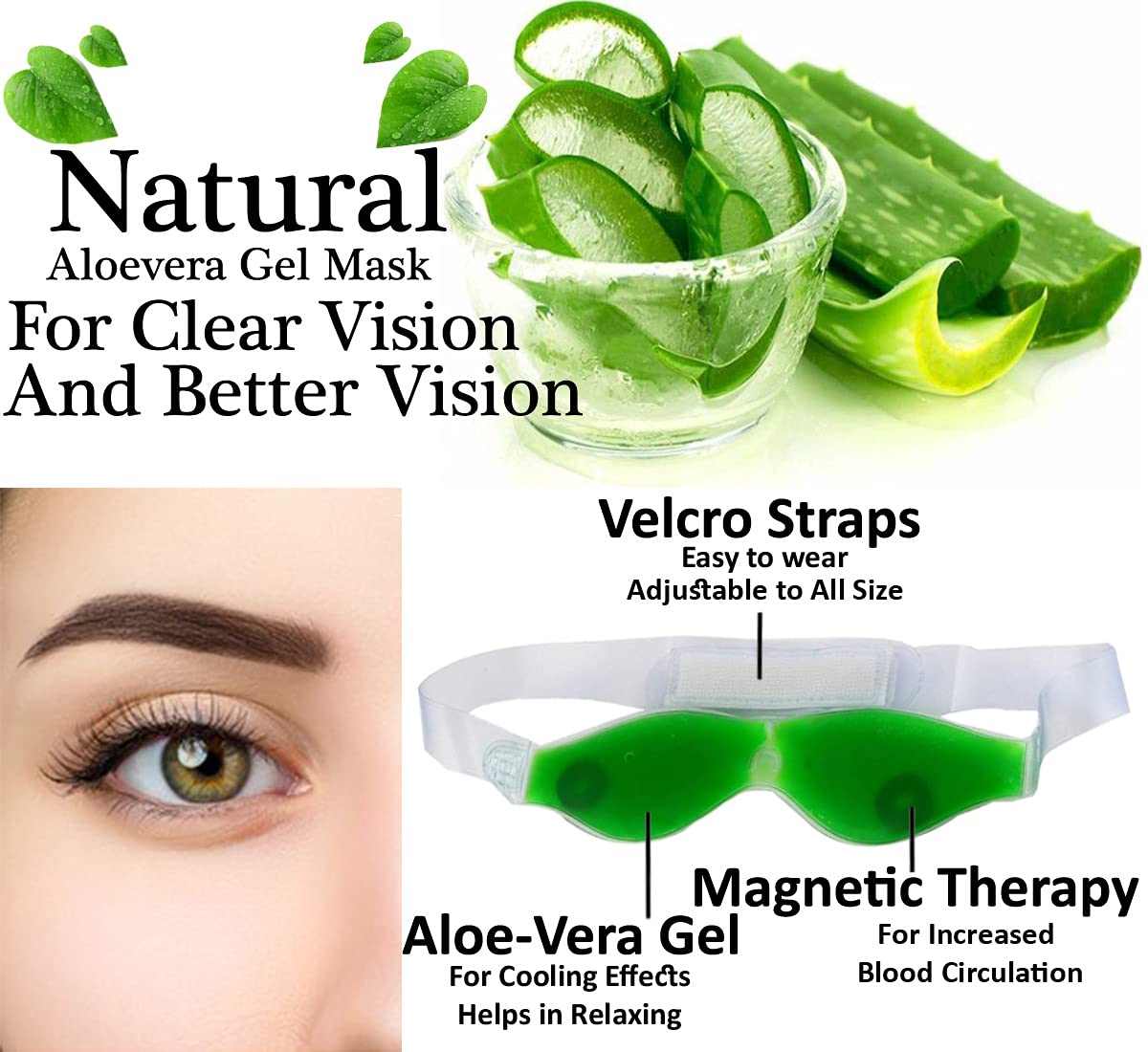 It provides a deep relaxation and light cooling pressure on the eye lids.Perfect for dry eyes/ allergies headache, puffy eyes, stress, fatigue, revitalizing, sound sleep conditions.Non-toxic Gel. Flexible even when chilled/ frozen.Relieves stresses formed during working on computer, kitchen, Movie & Watching TV, Late night sleep, long reading etc.Duly tested and poler-wisp set magnet helps in blood circulation.Place it on forehead if you are in or tension for 10 to 15 minutes.Aloe Vera Cool Gel Eye Mask Summer Ice Cooling Sleeping Mask for Eye Patches Remove Dark Circles Fatigue Cool Eyes Patch Pads Eye Care.This mask contains Aloe Vera gel with magnet which keeps cool in night If used daily there is possibility in decreasing eye lens It removes black mark below eye. It helps removes irritation of eyes It helps in deep & calm sleep,