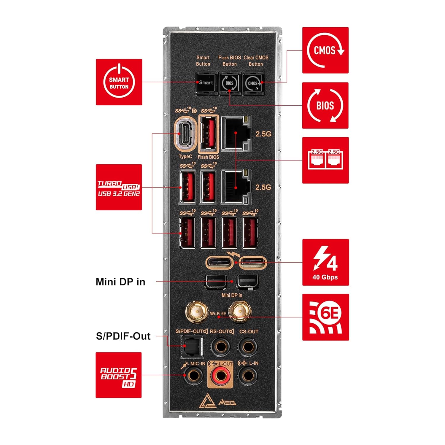 EXCELLENT CONNECTIVITY – Network includes an Intel Wi-Fi 6E module with Bluetooth 5.2 & dual 2.5Gbps LAN; Rear ports include 2 x Thunderbolt 4 (USB Type-C, 40Gbps) & Mini DP input & 7.1 USB High Performance Audio with Audio Boost 5 HD (S/PDIF output)