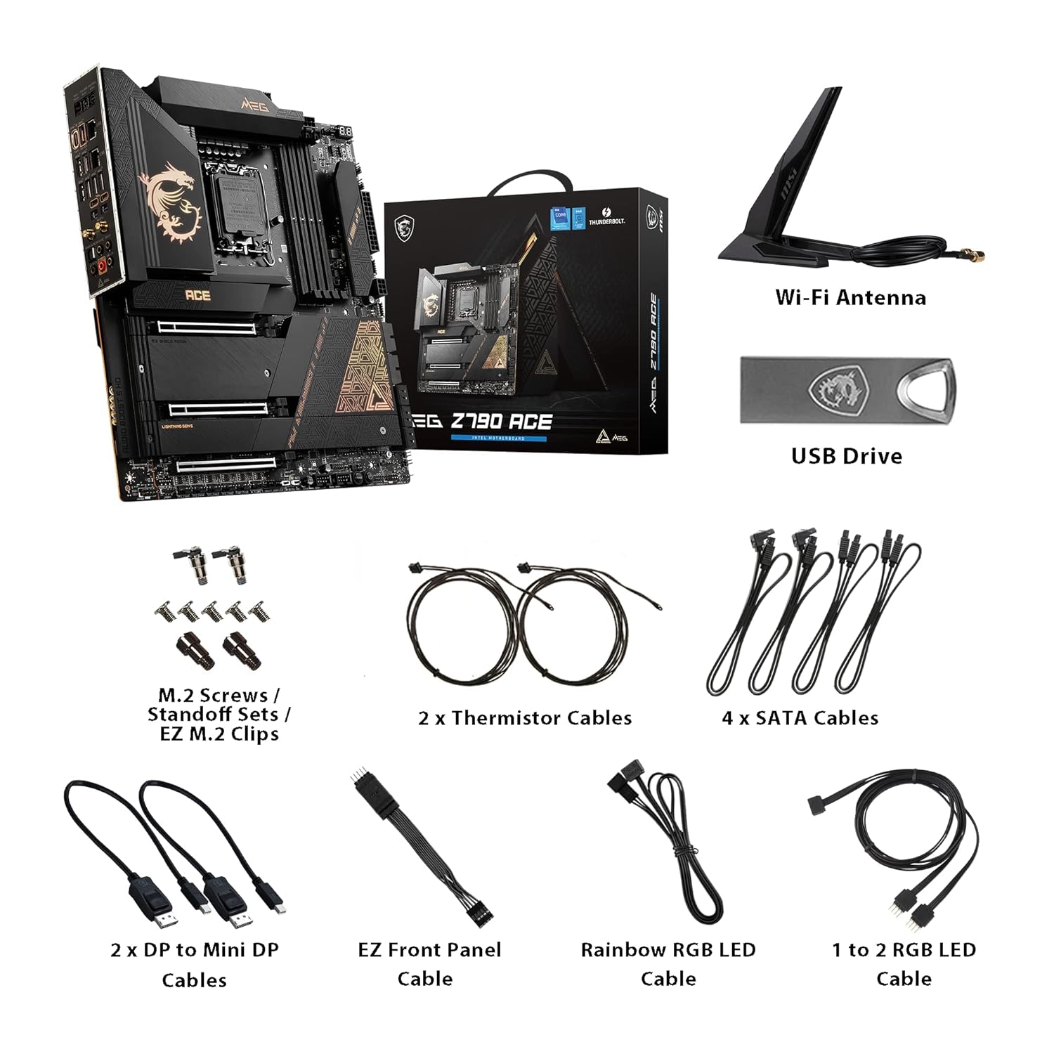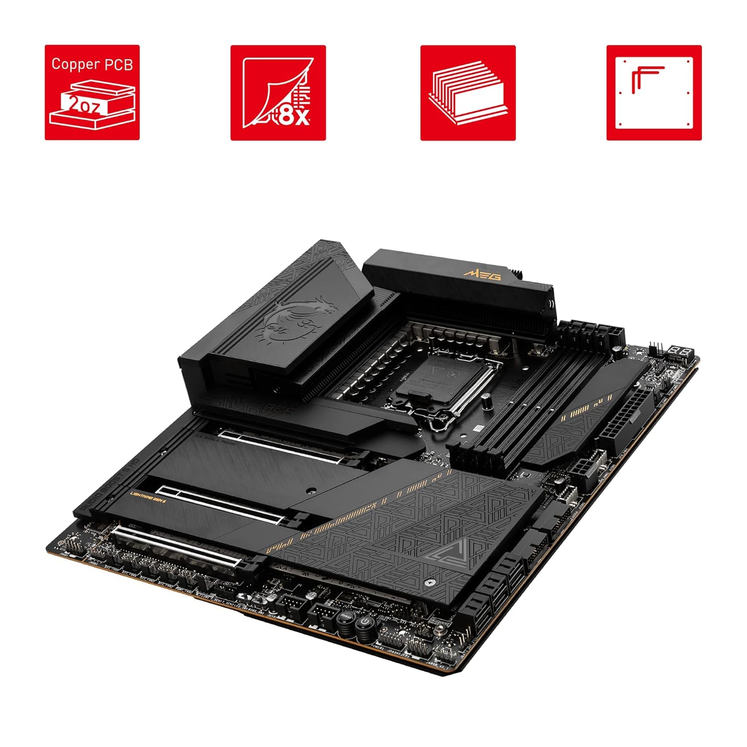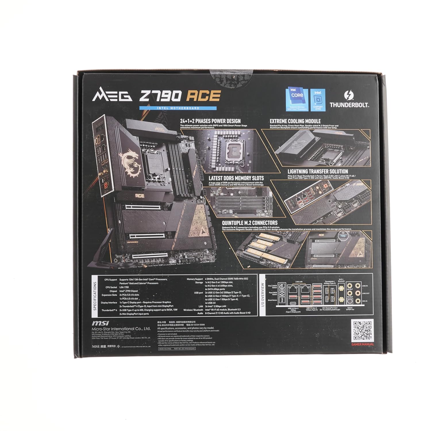 Supports Intel Core 12th & 13th Gen Processors (LGA 1700) 24 Duet Rail Power System with 105A Smart Power Stage 4 x DDR5 DIMMs with Memory Boost: Dual Channel (128GB Max. / 7800MHz OC) 2 x PCI-e 5.0 x16, 1 x PCI-e 4.0 x16 slots (AMD Multi-GPU supported) Lightning Gen5 & Gen4 M.2 slots with double-sided M.2 Shield Frozr Dual front USB 3.2 Gen 2×2 Type-C 20Gbps with one 60W PD Dual 2.5G LAN, Wi-Fi 6E & Bluetooth 5.2, Dual Thunderbolt 4 port, Audio Boost 5 HD