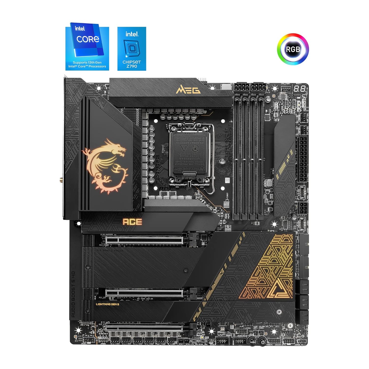 The MEG Z790 ACE motherboard supports 12th & 13th Gen Intel Core, Pentium Gold, and Celeron processors.
