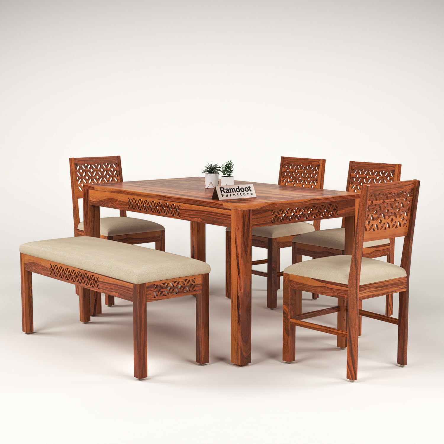 Ramdoot Furniture CNC Sheesham Wood Dining Table 6 Seater, Wooden Six Seater Dinning Table with 4 Chairs And Bench for Home, Dining Room Sets for Restaurants, Rosewood, Provincial Honey Finish