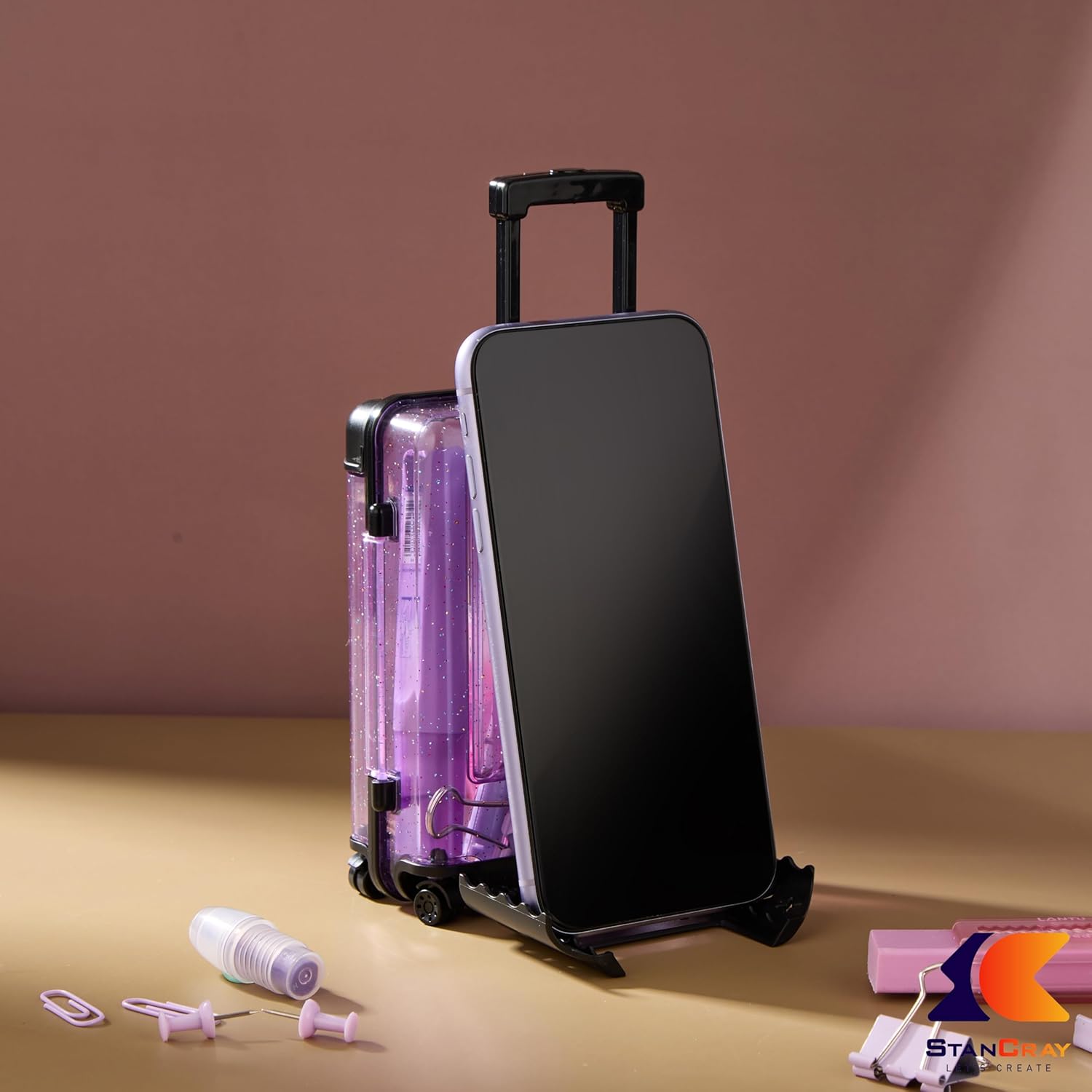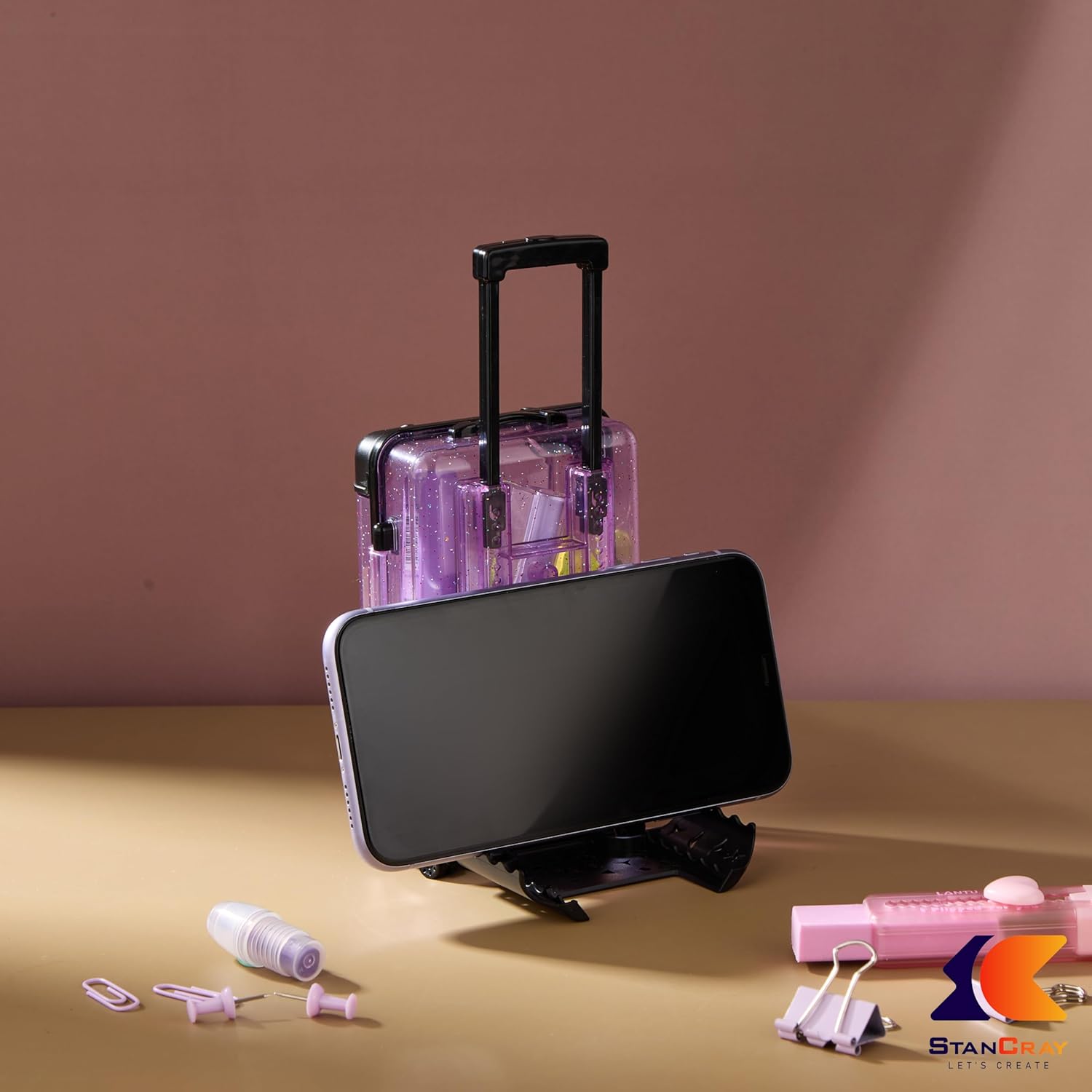 Introducing our Suitcase shaped mobile stand and storage box Add a playful touch to your desk – Perfect for holding your phone at the ideal viewing angle while keeping your essentials organized. – It’s both functional and stylish. – Crafted from durable materials, it features ample storage space for pens, notes, and other small items – Ideal for home or office use, this charming accessory brings fun and flair to your workspace!