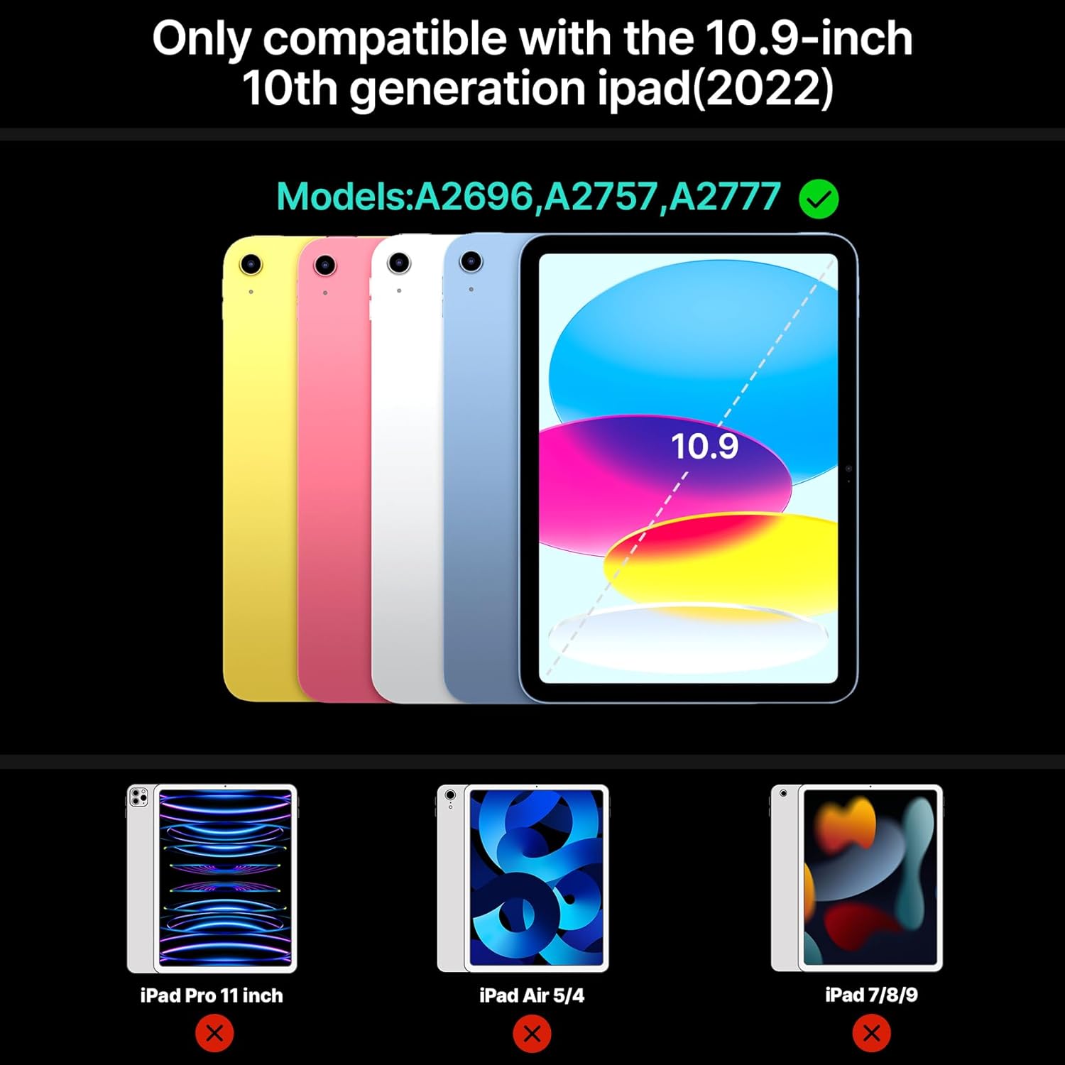 Compatible only with New 2023/2024 iPad 10th Generation (10.9-inch) ONLY i.e. A2696, A2757, A2777 only. ⚠️⚠️⚠️Notice: NOT Compatible/ FIT for any other iPad like Air 5th generation 2022, iPad Air (4th generation) 10.9 2020.Please check the back of your iPad to confirm the model. Please reach our to us for any further info.