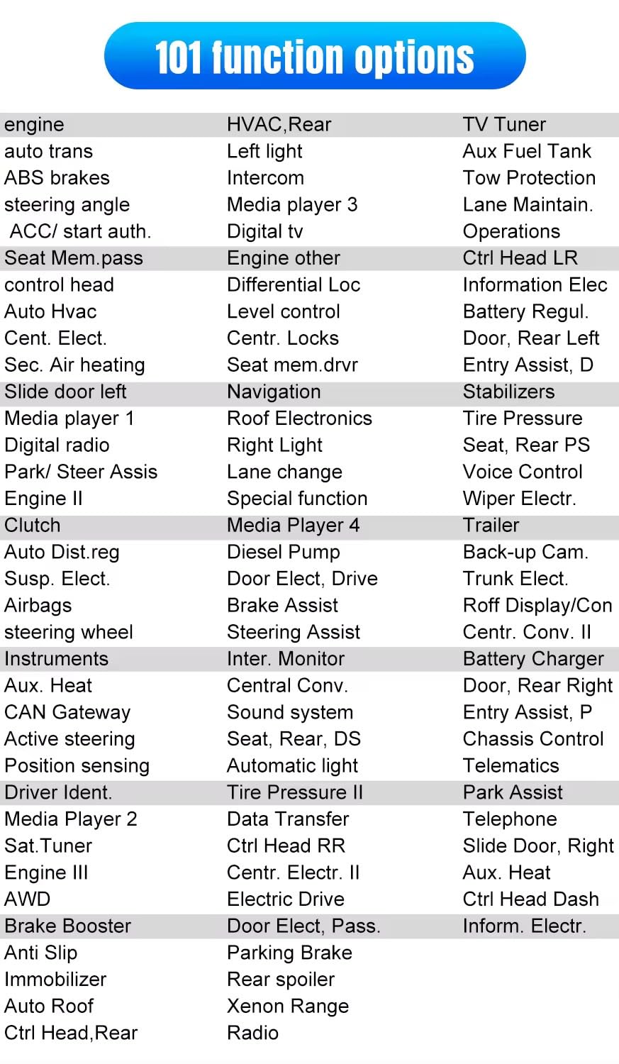 Special features For VW (VW, Seat, Skoda, Audi series): 1. Turn to corner adjustment, 2. Air suspension matching, 3. Fuel injection mouth coding, 4. DPF inspection regeneration, matching, 5. headlight adjustments, 6. battery matching, 7. EFB matching, 9. EFB matching, 10. flames matching.